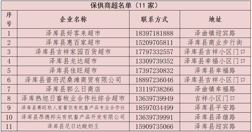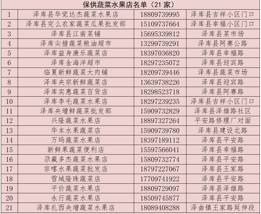 为有效保障疫情防控期间群众基本生活物资供应,我县已开设11家重点商超、21家蔬菜水果店、2家粮油店、4家药店、7家馍馍店、3家燃料燃气供应点,共设立48家保供点(个别保供点根据疫情会有所调整),保障人民群众各类基本生活物资供应,现通告如下:
