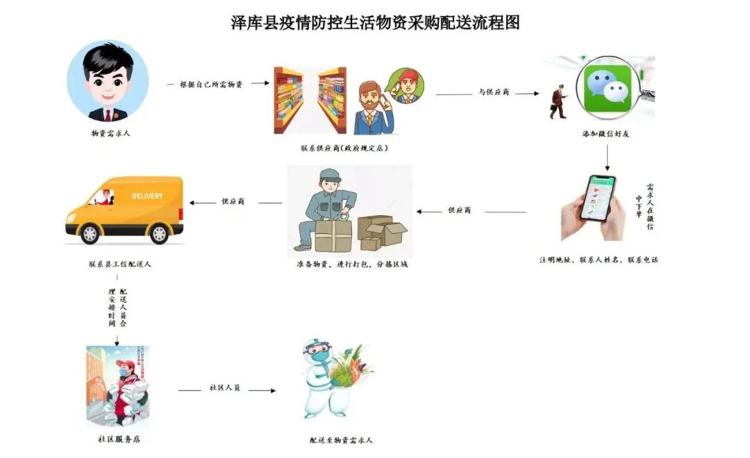 疫情防控期间,群众可向社区工作人员上报需求或直接联系保供点下单,由县工业商务和信息化局统一配送(当天15点前下单的当天配送,15点以后下单的第二天配送);主城区周边住户需求根据社区汇总结果,组织商家不定时上门销售生活物资(具体时间由社区通知各住户),由各社区工作人员合理安排居民外出采购时间,引导居民错峰采购生活物资,每户安排1人采购1次,居民每次采购时间不得超过半小时。购物期间,请理性有序排队购物,保持安全距离,不插队、不聚集,全程正确佩戴口罩,购物后立即返回,不得中途滞留。