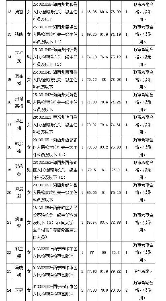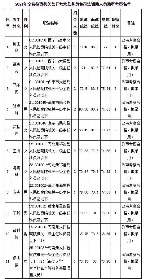 根据《青海省2021年公开考录公务员公告》《青海省2021年人民法院、人民检察院公开考录司法辅助人员(公务员)公告》要求,现将青海省2021年人民检察院公开考录一级主任科员以下公务员及相当职级层次以下司法辅助人员政审合格人员进行公示,公示期间,任何个人或单位可通过来电、来信、来访等形式,署名对公示对象的德、能、勤、绩、廉等方面的情况和问题进行实事求是、客观公正的反映。